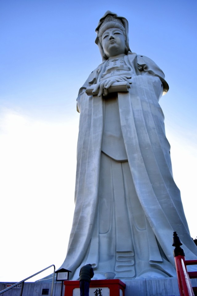 A man prays at the base of this statue of the Goddess of Mercy, which was built in 1936 and overlooks the city of Takasaki, Japan.