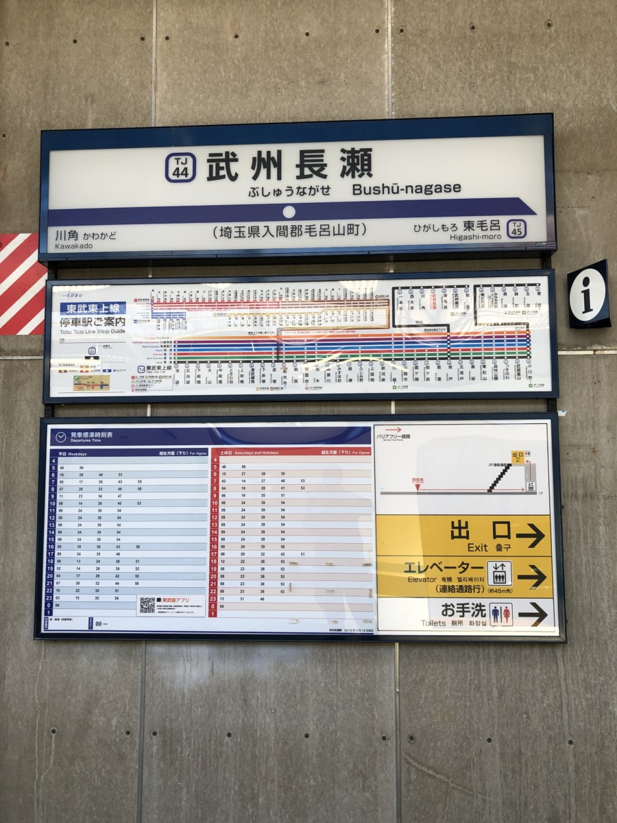 Bushu-Nagase is part of Moroyama city, on the Tobu Ogose line, out towards the north-west of Saitama where Chichibu begins. Moroyama’s a bit like the last hurrah for urban sprawl; the buildings and the people are trying but I guess their hearts aren’t really in it. Moro station, just up the road, is on the other side of the mountains whose trails criss-cross the area north of Musashi-Yokote: past that, it’s hills and greenery and riversides all over the place.