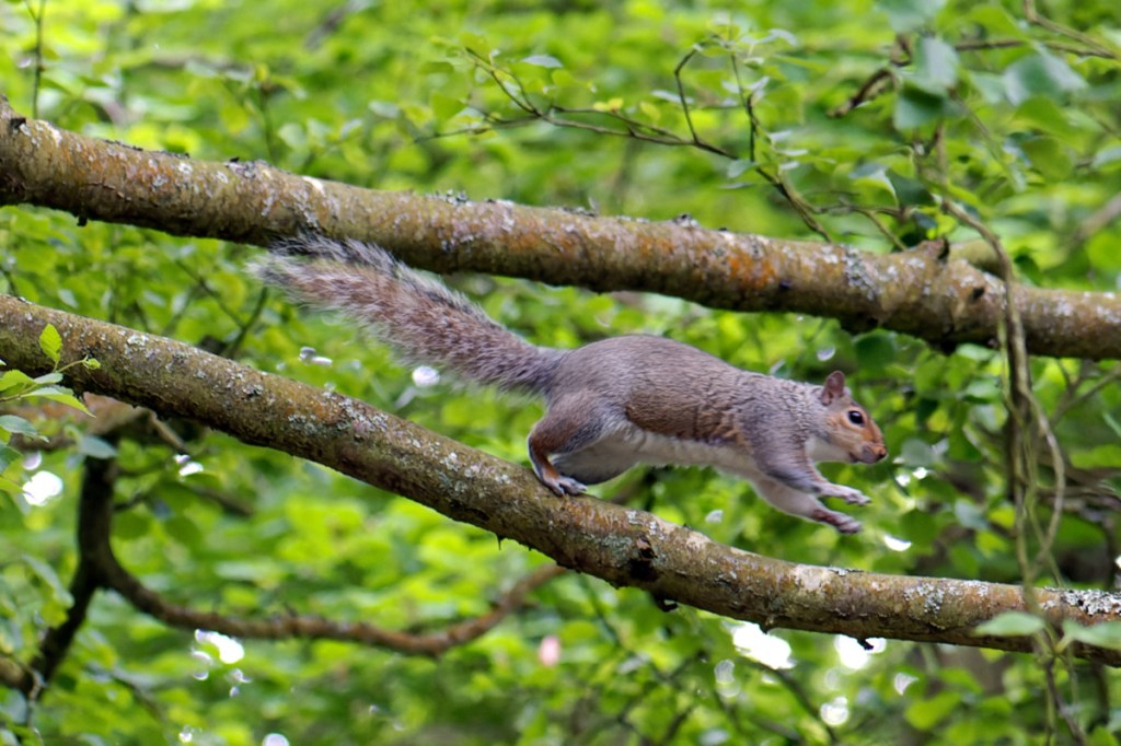 A squirrel about to leap into the shadows of an adjacent tree, as seen in the park today.